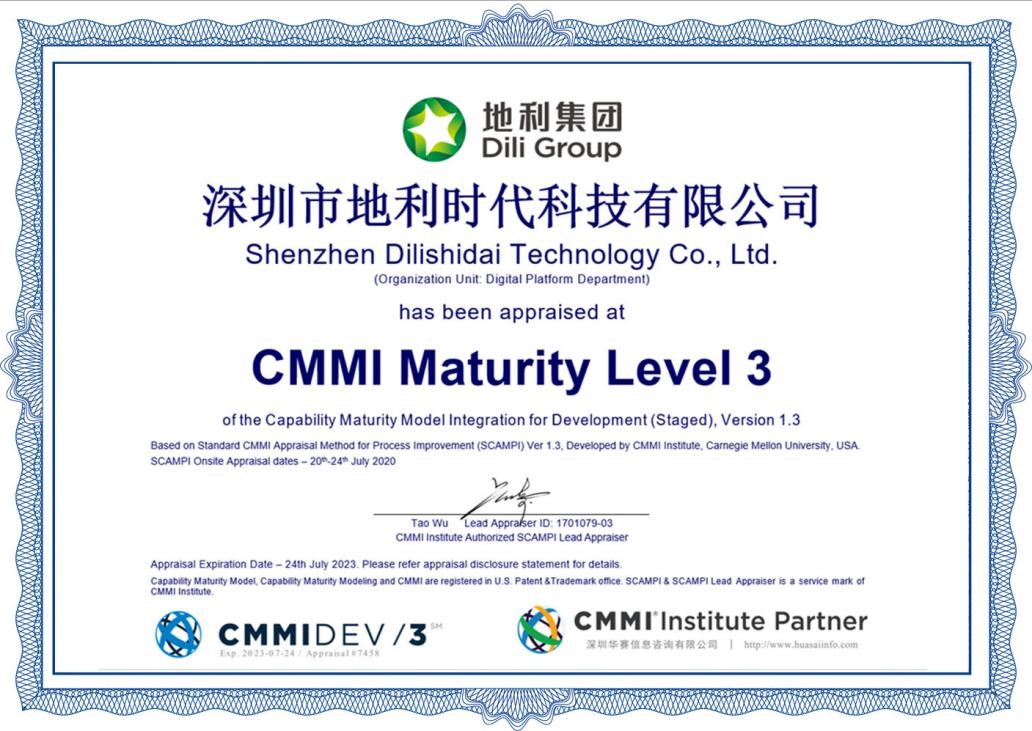 作为中国地利集团科技赋能的主力军,深圳市地利时代科技有限公司于2020年7月接受了CMMI评估小组对软件研发过程管理、项目管理、项目研发、过程支持等能力的现场审核和评估。最终,评估小组判定公司符合CMMI3级规范和要求,经美国SEI研究院审计及公示后,于近日向深圳市地利时代科技有限公司颁发了CMMI3级证书。